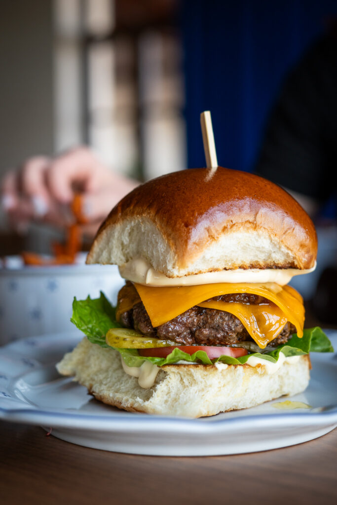 Hovězí cheddar burger – hovězí maso, cheddar, rajče, okurek, majonéza, cibulová marmeláda, salát
