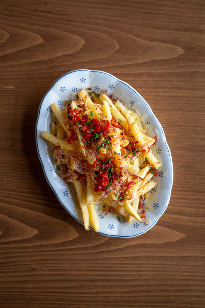 Hranolky, strouhaný čedar, slanina, chilli papričky