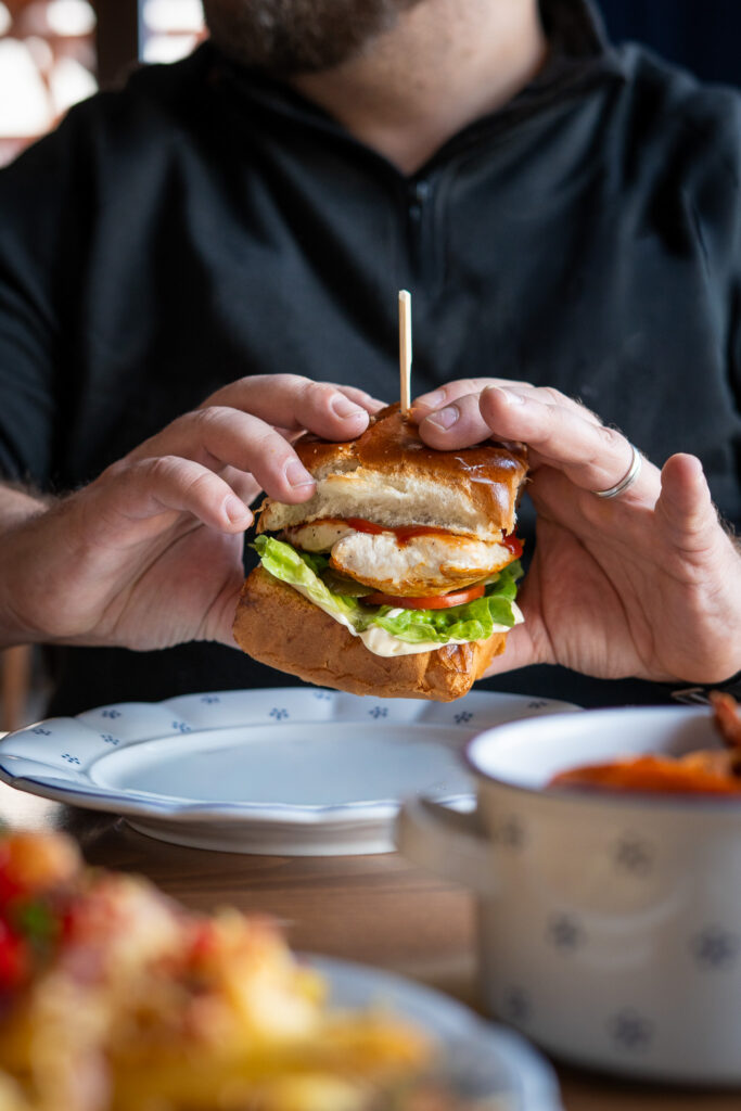Kuřecí burger – kuřecí prso sous-vide, kečup, majonéza, okurek, salát, rajče