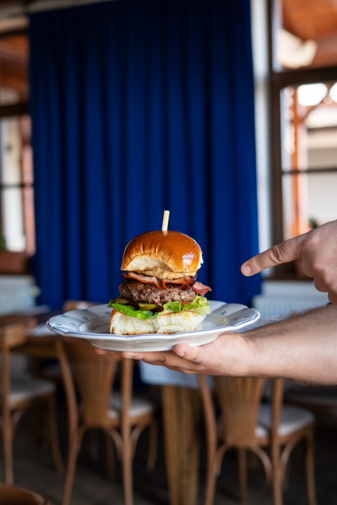 Hovězí slaninový burger – hovězí maso, slanina, rajče, okurek, slaninová majonéza, cibule, salát