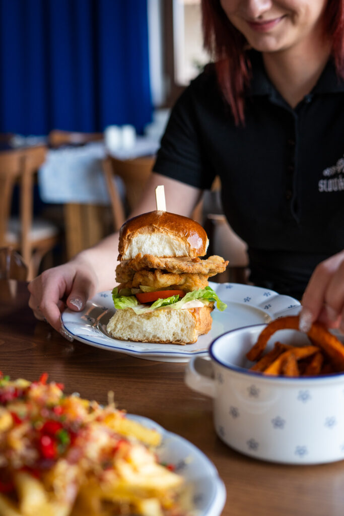 Šnycl burger – hovězí řízek, papriková majonéza, kyselý okurek, rajče, salát, cibule