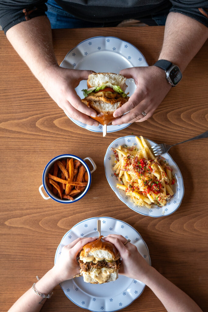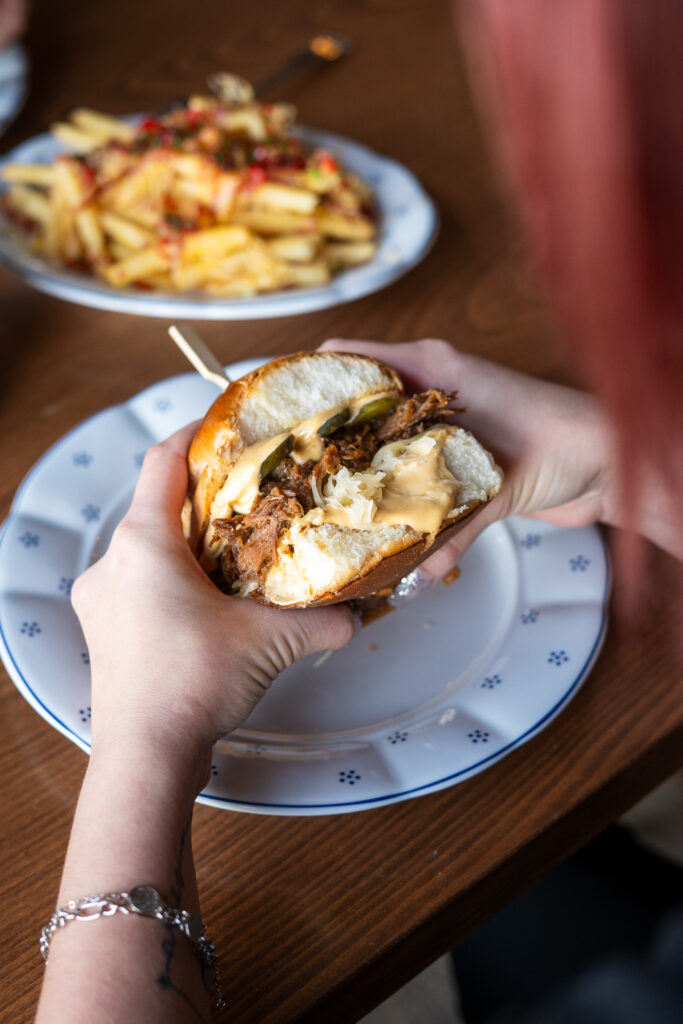 Kachní burger – trhané kachní maso, hoisin omáčka, piklované okurky, majonéza, kysané zelí